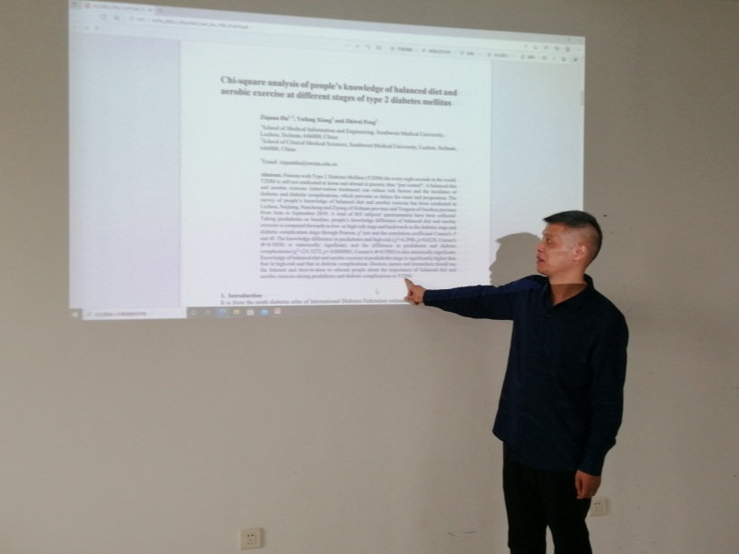 数学支部党员于2021年7月5日,在汇文楼四楼由胡自权老师开展了标题为:Chi-square analysis of people’s knowledge of balanced diet and aerobic exercise at different stages of type 2 diabetes mellitus的文献精读活动。