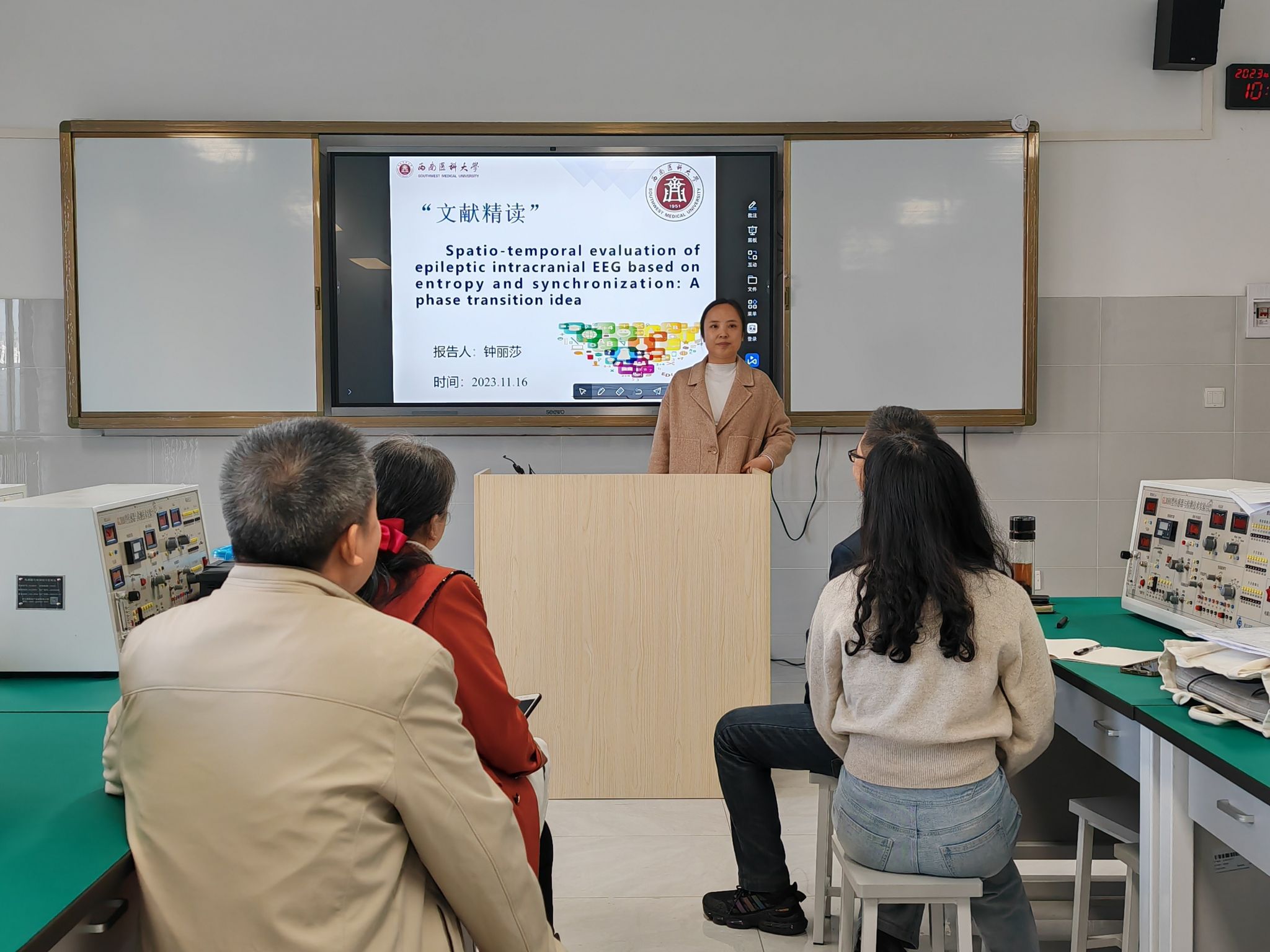 11月16日,医学工程技术教研室在文渊楼321开展题为“Spatio-temporal Evaluation of Epileptic Intracranial EEG based on Entropy and Synchronization: A Phase Transition Idea”的文献精读活动,由钟丽莎博士主讲。教研室全体教师,影像专业博士生、研究生参加了此次活动。此次讲座旨在分享该领域的前沿成果。