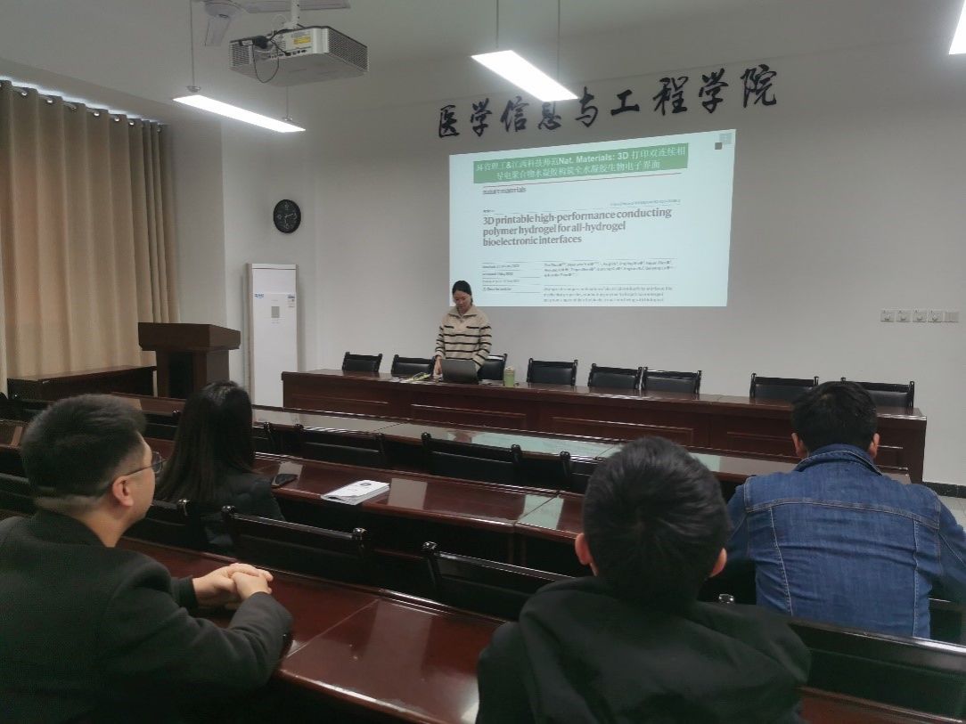 11月27日,物理与电子技术教研室在文渊楼325开展题为“3D printable high-performance conducting polymer hydrogel for all-hydrogel bioelectronic interfaces”的文献精读活动,由周秋霞博士主讲。教研室全体教师参加了此次活动。此次讲座旨在分享3D打印技术在该领域的前沿成果。