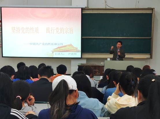尹德辉详细讲解了中国共产党的性质与宗旨,阐述了中国共产党是中国工人阶级的先锋队,是中国人民和中华民族的先锋队,是中国特色社会主义事业的领导核心,代表中国先进生产力的发展要求,代表中国先进文化的前进方向,代表中国最广大人民的根本利益这一基本性质。中国共产党的性质决定了一切从人民的利益出发,全心全意为人民服务是它的唯一宗旨。艰难的长征、辛酸的狱中八条、抗日战争、解放战争、抗美援朝等一个个事例,雷锋、孔繁森、牛玉儒、邓平寿、钱学森的光荣事迹,表明新中国的成立来之不易,没有先辈们的牺牲和付出,就没有现今的安定生活。最后,尹德辉和全体同学一起朗读了毛主席的《为人民服务》,让同学们更加深刻的理解中国共产党的宗旨—为人民服务。