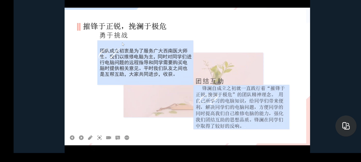 在此次线上电脑知识宣讲志愿活动中,为了让同学们能够自己动手解决电脑问题,锋澜维修队的成员从电脑不能上网、不能充电、卡顿等同学们日常生活中容易遇到的电脑问题逐一为同学们讲解故障原因并提供了解决方法。此外,锋澜维修队还向同学们分享了电脑重装、电脑备份、浏览器设置等电脑使用技巧。