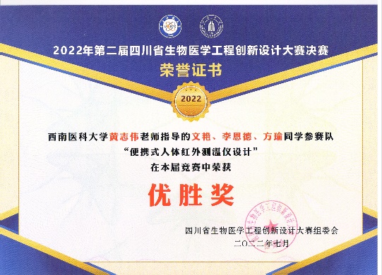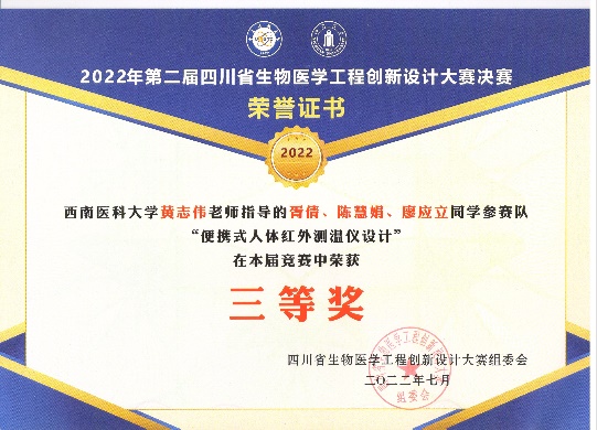 近日,第二届四川省生物医学工程创新设计大赛决赛在电子科技大学举行。大赛由四川省教育厅和四川省科学技术协会主办,电子科技大学和四川大学共同承办,共有160支队伍报名参赛,129支队伍提交参赛作品参与预赛遴选。经过评审专家组公平公正的评审,伟德国际bevictor1946黄志伟老师指导,胥倩、陈慧娟、廖应立组队和文艳、方瑜、李恩德组队完成的作品“便携式人体红外测温仪设计”分别获得三等奖和优胜奖。