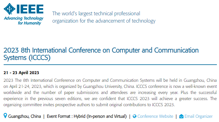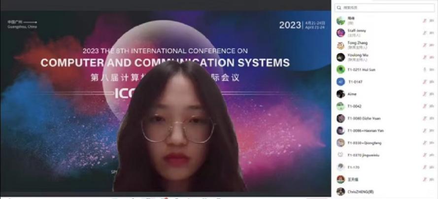 2023年4月21日-24日,第8届TheInternational Conference on Computer and Communication Systems会议在中国广州举行,孙珲同学作为论文第一作者参加会议进行全英文学术汇报,并与点评专家进行了在线交流与讨论。
