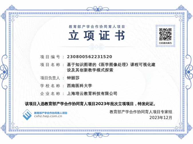 钟丽莎申报的《基于知识图谱的《医学图像处理》课程可视化建设及其创新教学模式探索》,将与上海培云教育科技有限公司合作,旨在通过知识图谱的运用,推动《医学图像处理》课程的可视化建设,探索创新的教学模式,为医学图像处理领域的人才培养提供新思路和方法。