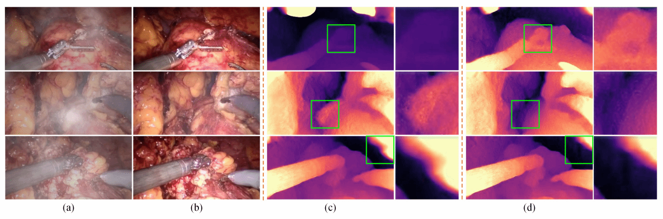在微创手术视频中由于烟雾的影响,无标签的单目腹腔镜深度估计具有挑战性。为此,在这项工作提出了一种新的单目内窥镜视频深度估计方法,将其分解为去雾和深度估计两个步骤。第一步,作者开发了一种DS-cGAN以减轻不同浓度的烟雾成分。生成器网络包括锐化导向编码模块(SGEM)、残差密集瓶颈模块(RDBM)和精细化上采样卷积模块(RUCM),还原了更详细的器官边缘和组织结构。第二步,设计由一个深度网和两个Posenet组成的高分辨率残差HRR-UNet来提高深度估计精度,并利用相邻帧进行摄像机自运动估计。该方法在训练和推理阶段既不需要人工标记也不需要患者计算机断层扫描。并且不假设亮度恒定,适用于内窥镜手术。在Hamlyn中心腹腔镜数据集上的实验研究表明,该方法可以在保留手术部位血管、轮廓和纹理的情况下,在真实手术场景中有效地获得准确的去雾后的深度信息。实时帧率达到94.45fps。这项研究具有良好的临床应用前景,并为内窥镜图像三维重建提供了重要参考。