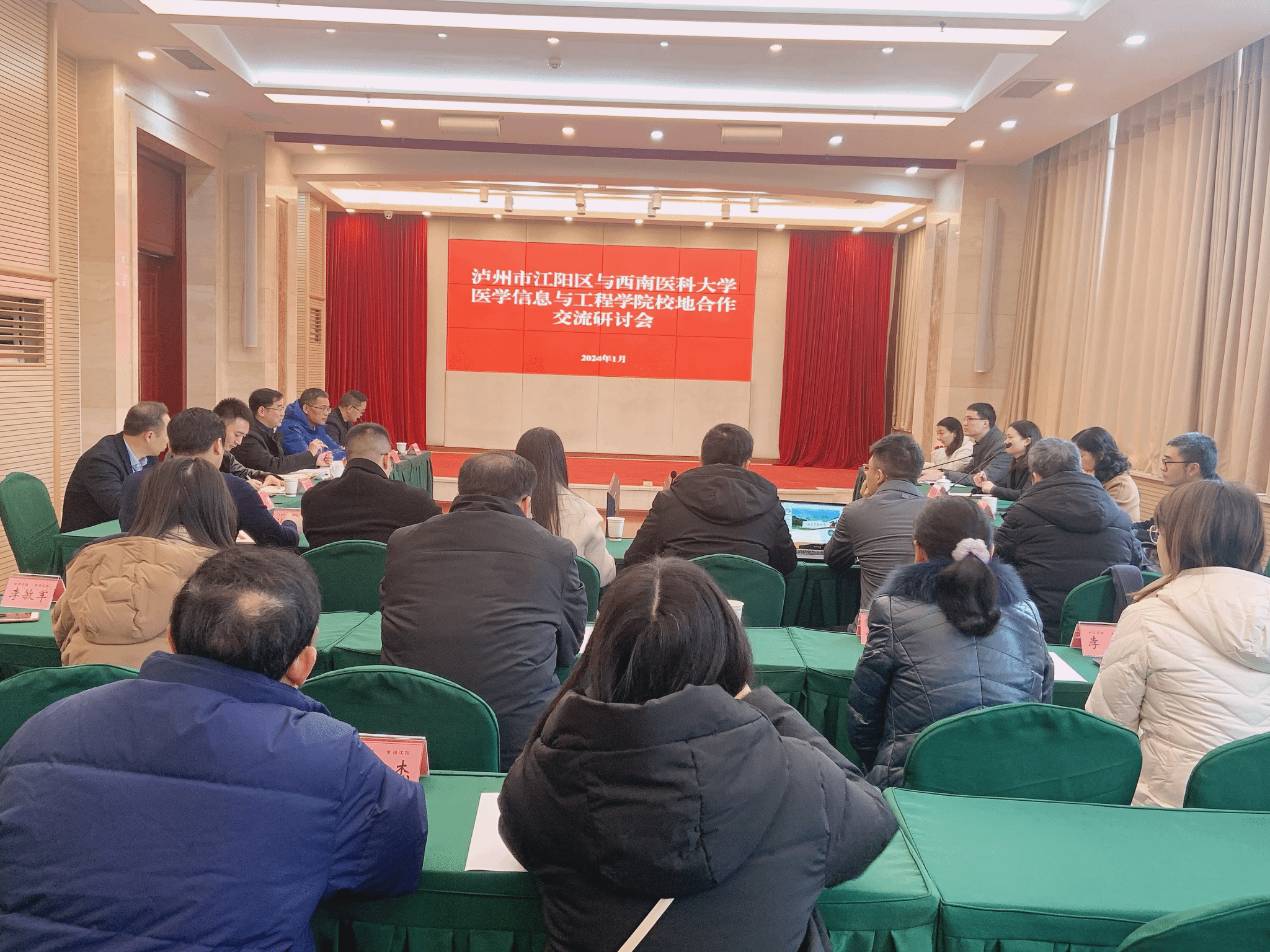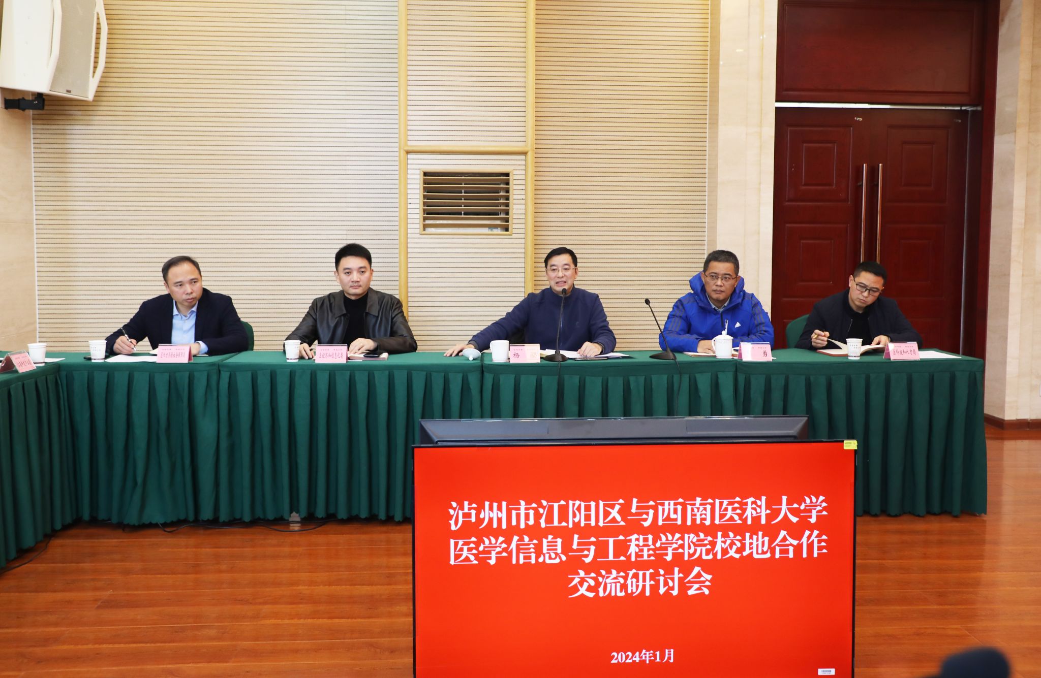 实地参观结束后,全体人员来到了泸州市江阳区人民政府,开展交流研讨。会上,观看了江阳区宣传片,感受到了江阳区先进的科技产业以及繁荣的商业氛围。黄志伟详细介绍了学院的发展历程、科研教学及人才培养情况。在学院博士代表要小鹏、周赟、胡安斌介绍了个人的科研研究成果后,江阳区政协副主席罗勇、经济和信息化局局长黄鹏、科技和人才局局长刘燕强、人力资源和社会保障局局长税邦荣、卫生健康局局长马英、经济合作外事局长魏小龙、江南科技产业园管委会主任吴磊就双方如何开展合作和科研成果转化进行了深入的交流。