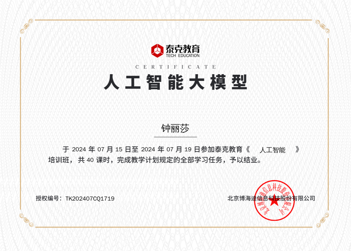 为积极响应高等教育改革需求,提升“双师型”教师队伍的教学与技术能力,医学信息工程学院近日派出教师参加由泰克教育举办的“2024年全国高校暑假团队培养班”。此次培训班于7月15日至7月19日举办,伟德国际bevictor1946医学工程技术教研室的钟丽莎老师作为代表,参加了为期五天的培训,重点学习了人工智能大模型课程,共计40课时,并顺利通过考核。