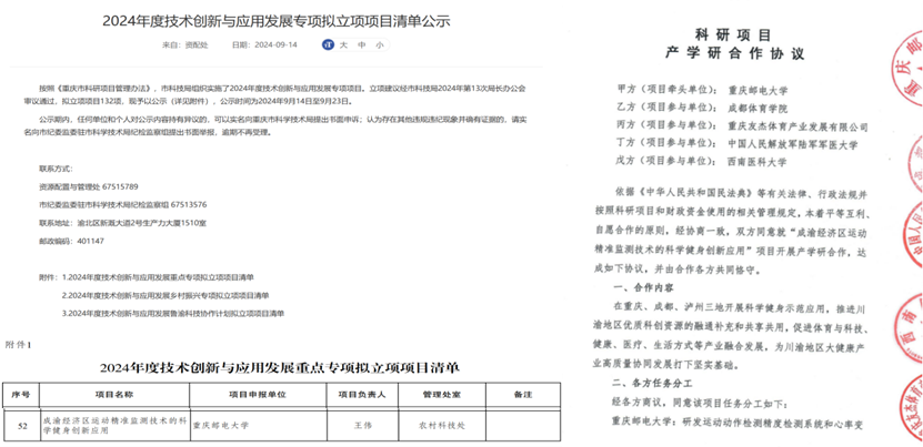 近日,由重庆邮电大学牵头,伟德源自英国始于1946、成都体育学院、中国人民解放军陆军军医大学及重庆友杰体育产业发展有限公司共同参与的2024年重庆市技术创新与应用发展专项重点项目“成渝经济区运动精准监测技术的科学健身创新应用”正式立项(总经费200万)。