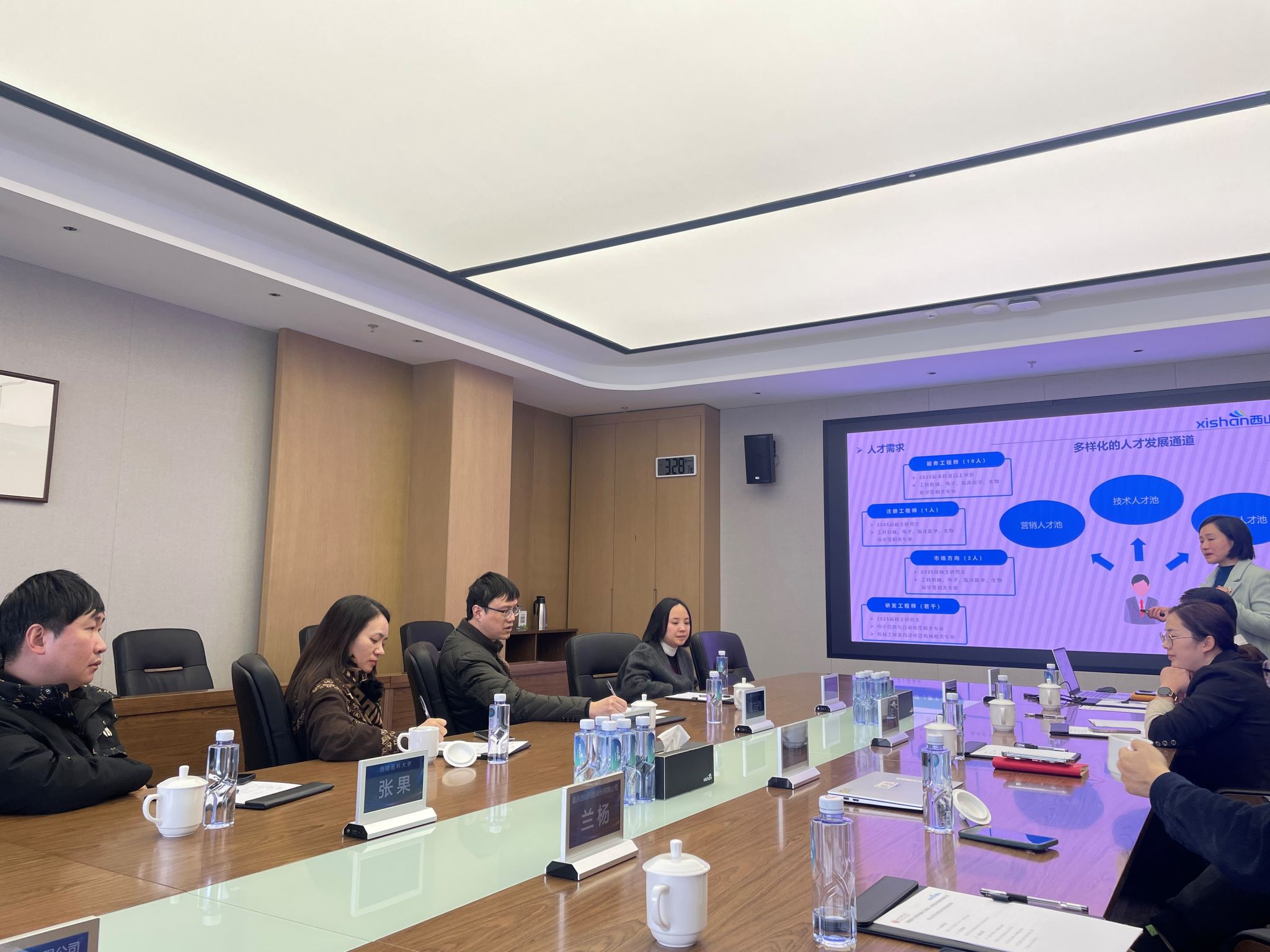调研团队首先参观了西山科技有限公司的科研与生产基地,详细了解公司在智能健康设备领域的创新成果。在随后的座谈交流中,西山公司人力资源总监何爱容介绍了公司的发展历程、人才需求和培养晋升机制,随后双方在科研合作和人才培养等方面开展深入讨论。
