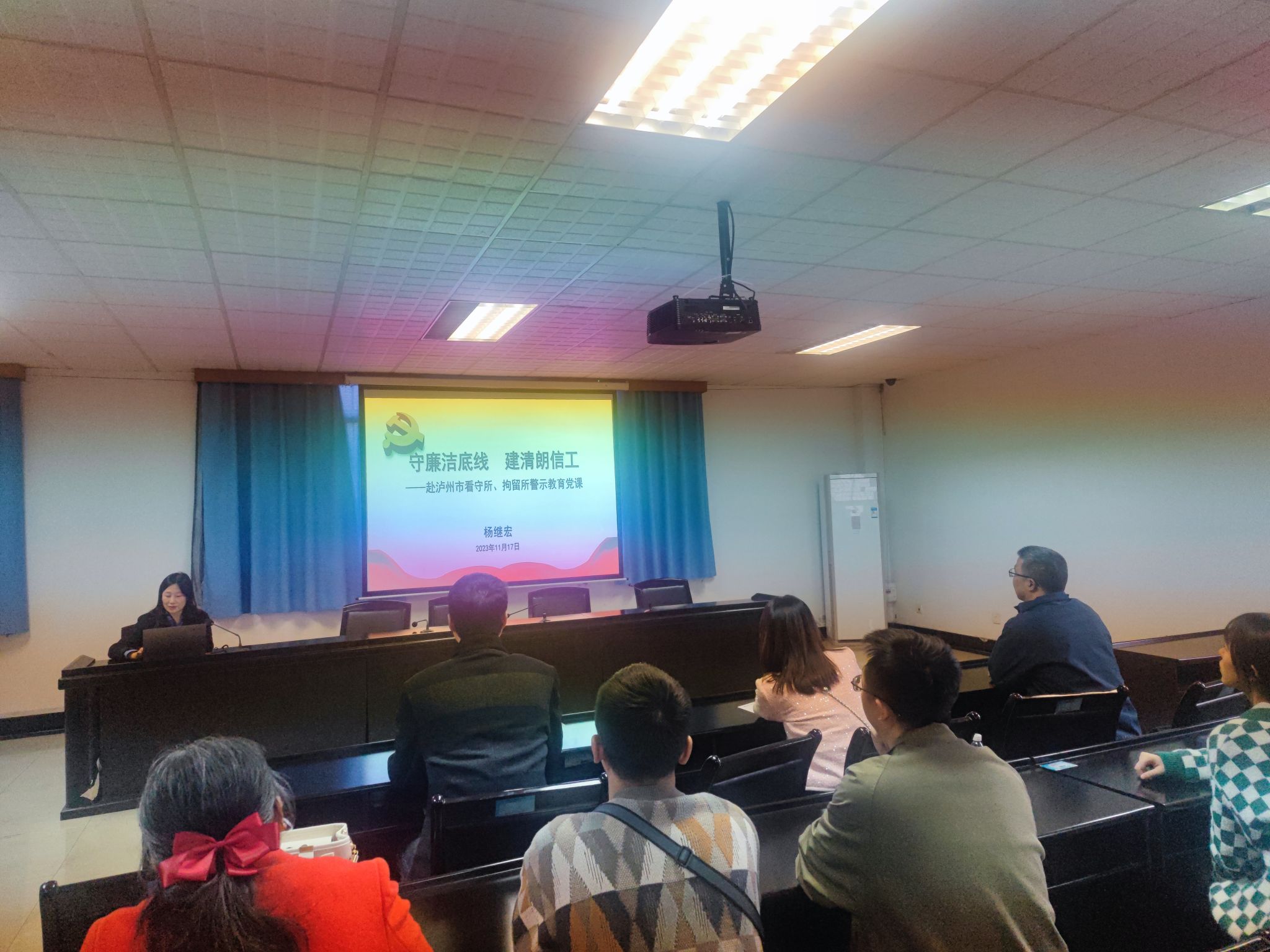 现场教育结束后,党委书记杨继宏讲党课《守廉洁底线 建清朗信工》,从漫溯历史-全面回顾我党党风廉政建设历程、认清形势-深刻认识全面从严治党的重大意义、知纪明纪-让铁的纪律成为我们的自觉遵循三个方面,结合详实的案例,上了一场严肃生动的党课。希望全体党员、教师扣好廉洁从学、廉洁从教、廉洁从业的“第一粒扣子”,严守纪法规矩,增才干,强本领,在全面建设社会主义现代化国家新征程上,在全力推进学校“138”发展战略的新实践中,扬帆启航,建功立业,让党旗高高飘扬!