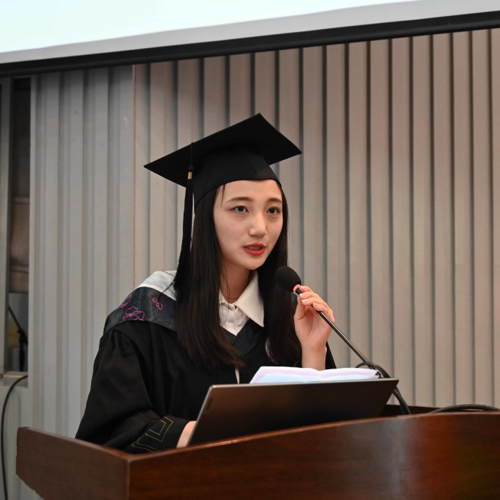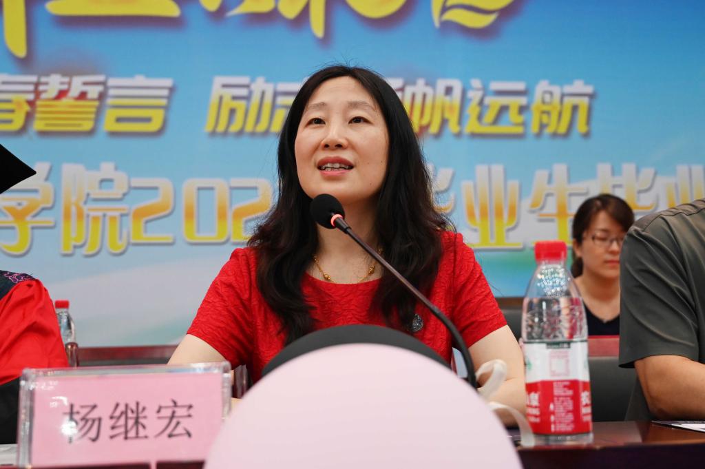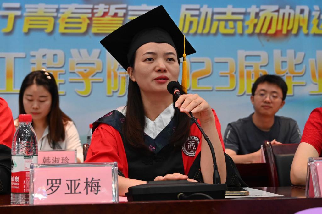 邓欢老师作为教师代表发言,希望毕业生们坚定初心,保持自己的节奏,认真过好自己的生活,找到属于自己的光亮;不要害怕做选择,不要后悔自己的选择,每一条没有被选择的路上也一样布满了任务点;要有自己的坚持,要做一流版本的自己,不做二流版本的别人;要锻炼好身体,爱护自己的身心健康;要心里有光,让世界也会因此而灿烂。